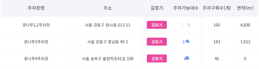 - 광나루 4주차장: 서울 송파구 올림픽로41길 108, 46~55대 수용